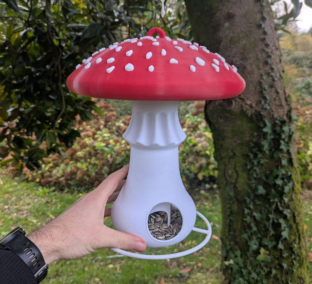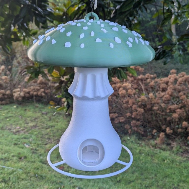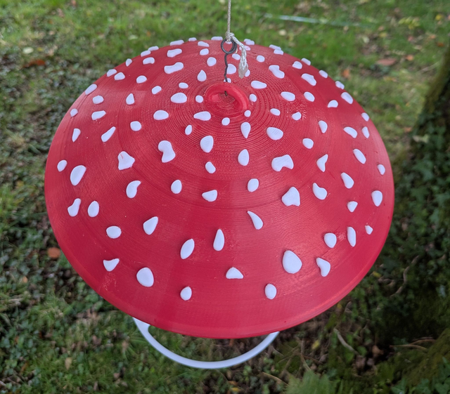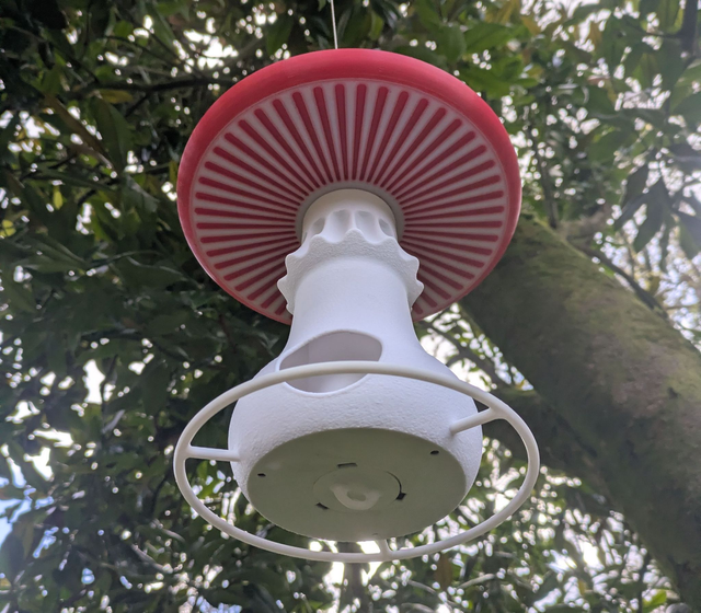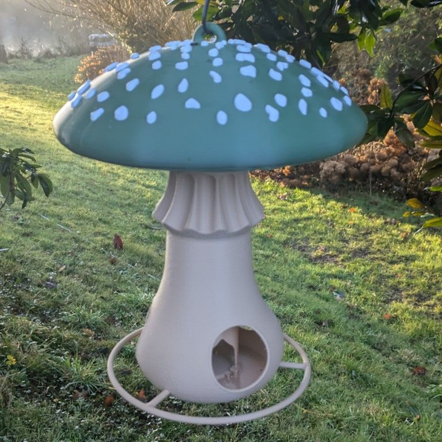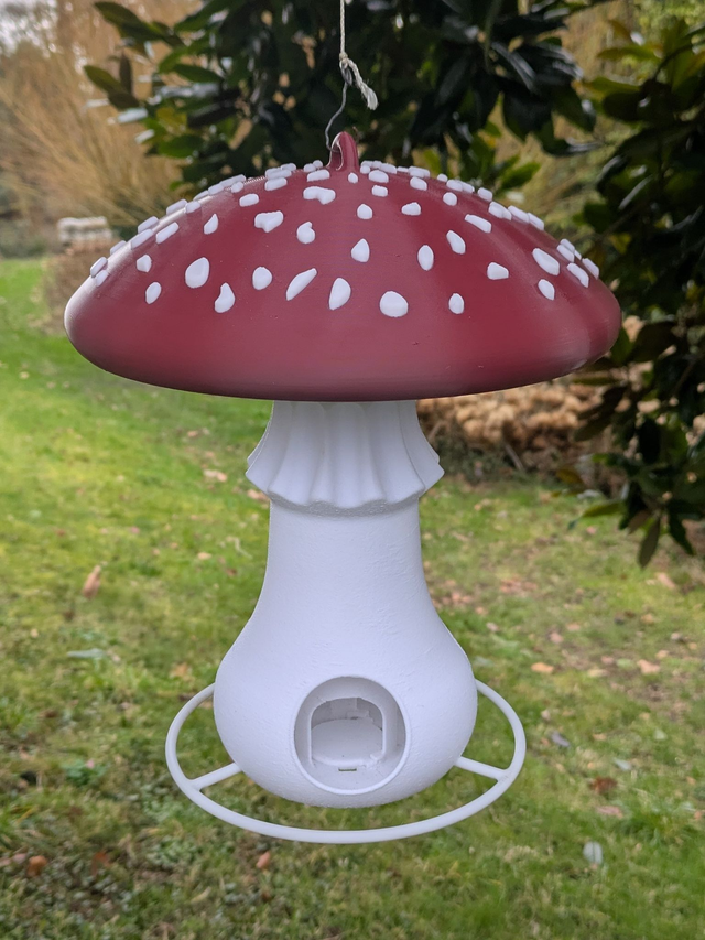 Mangeoire autonome à oiseaux originale en forme de champignon amanite tue-mouches à suspendre style organique minimaliste, décoration de jardin.