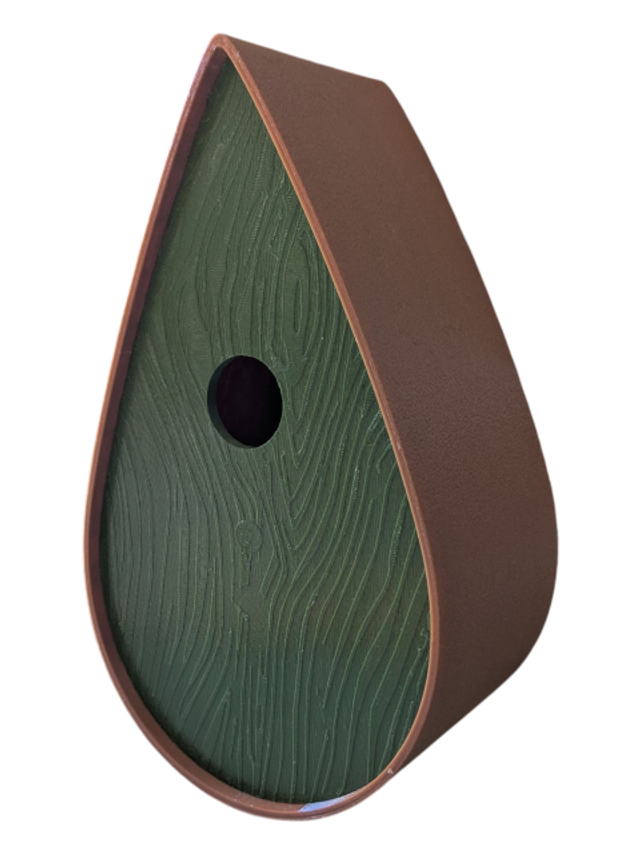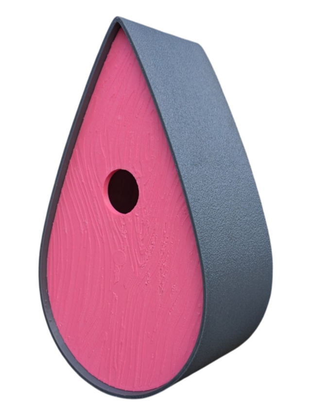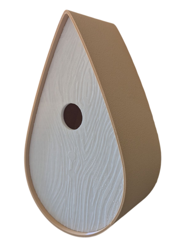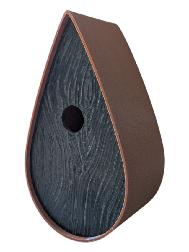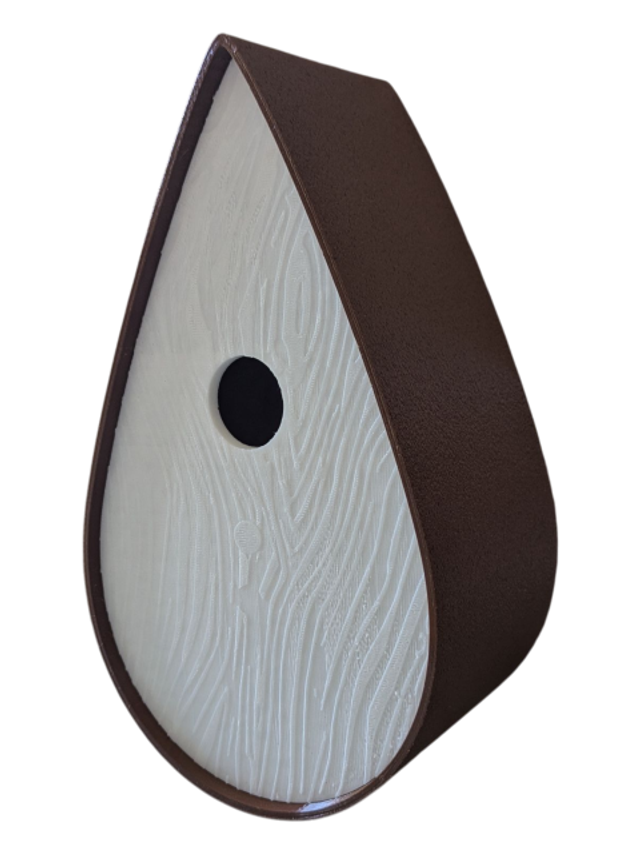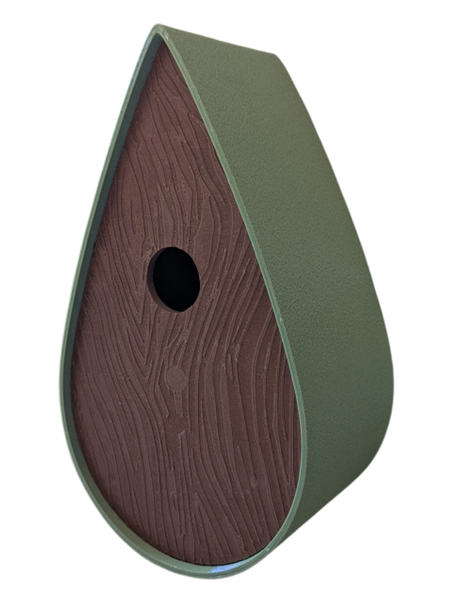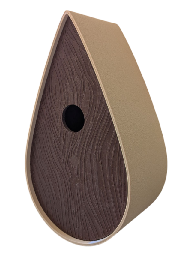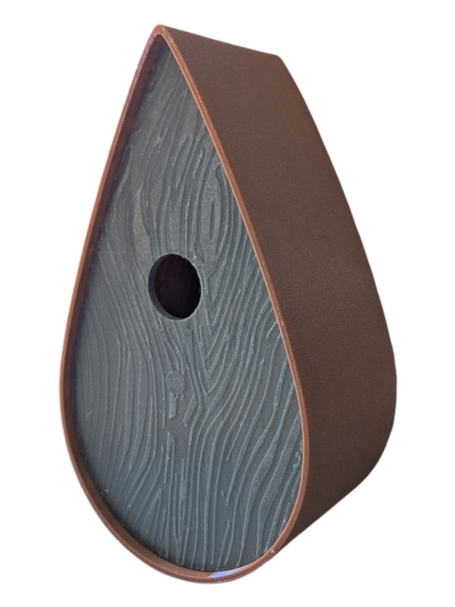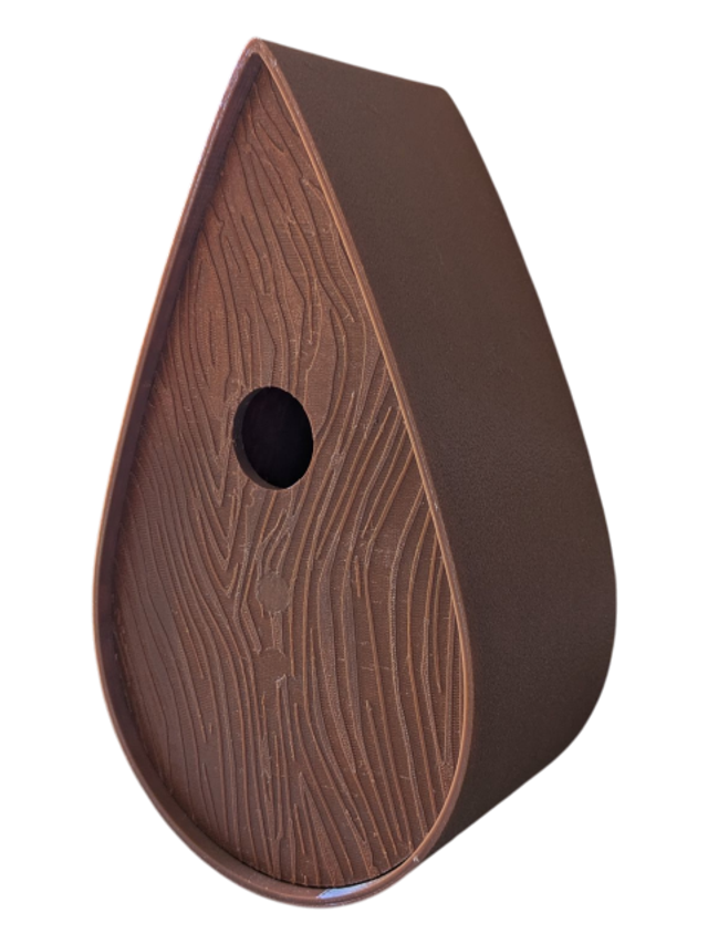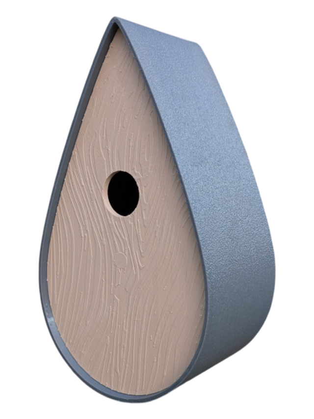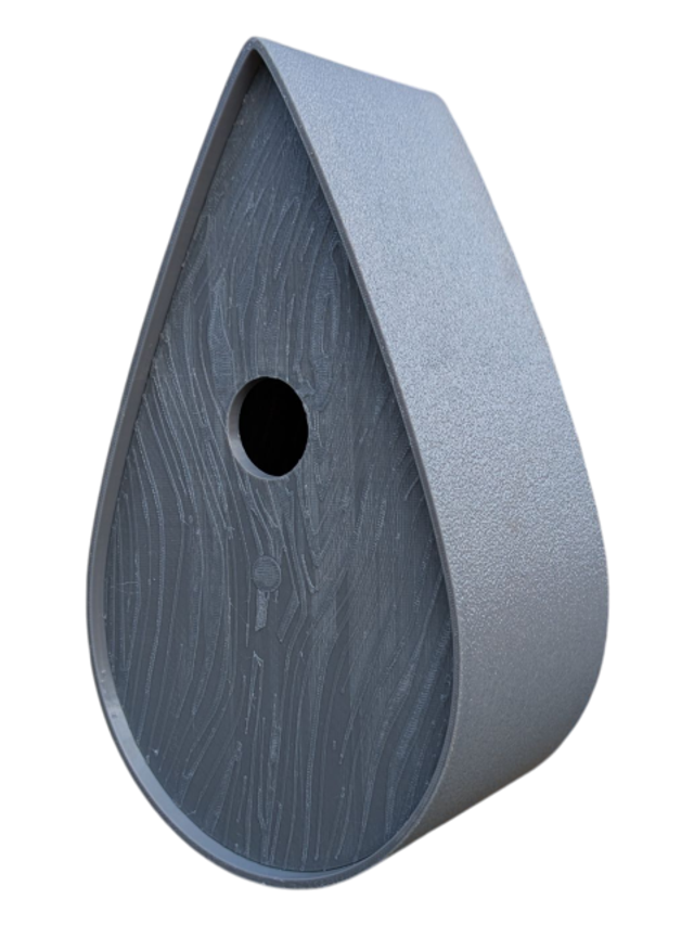 Nichoir à oiseaux de la nature original de style organique en forme de goutte d'eau effet strié soyeux, rugueux et face avant effet bois naturel. Décoration de jardin, décoration d'extérieur. L'idéal pour aider les oiseaux de la nature à procréer et préserver la biodiversité.