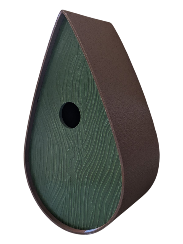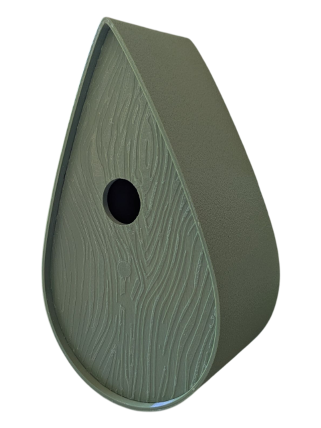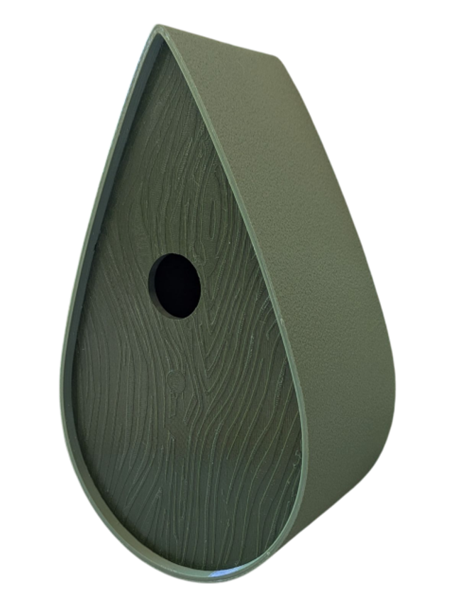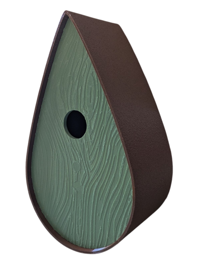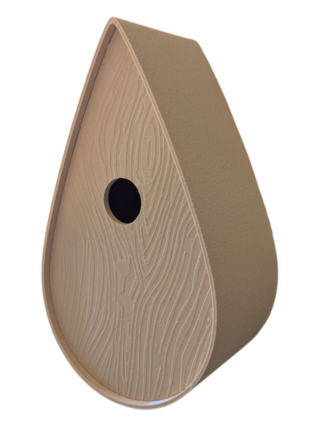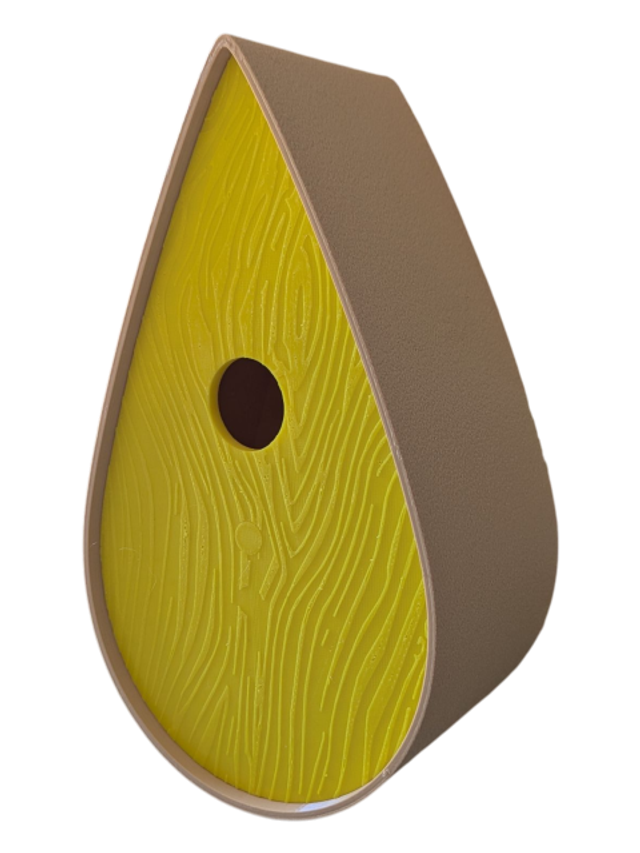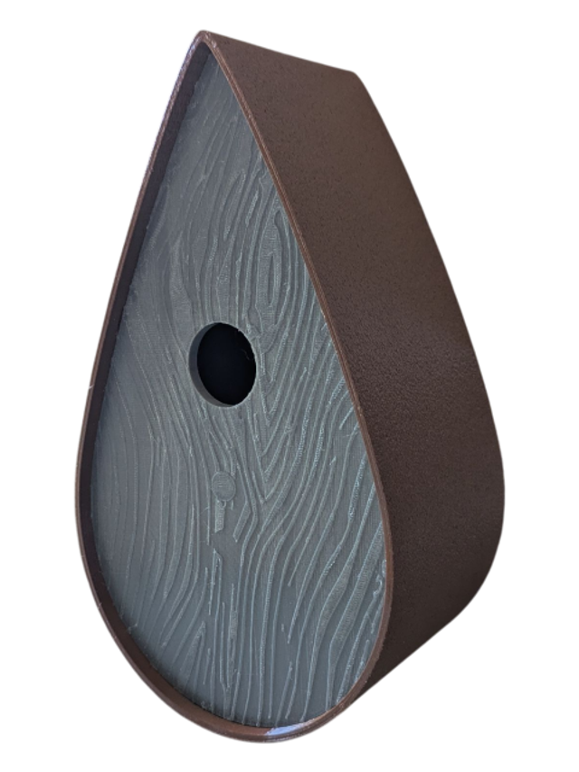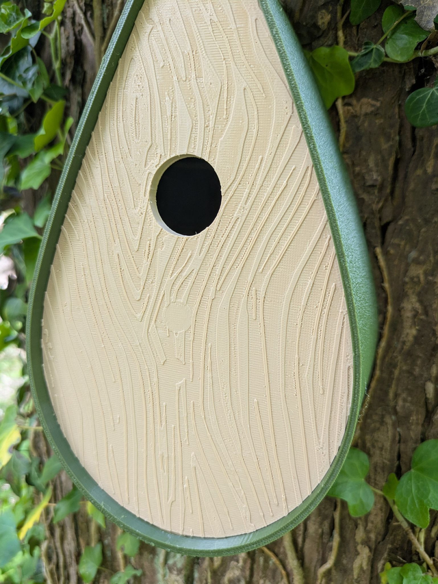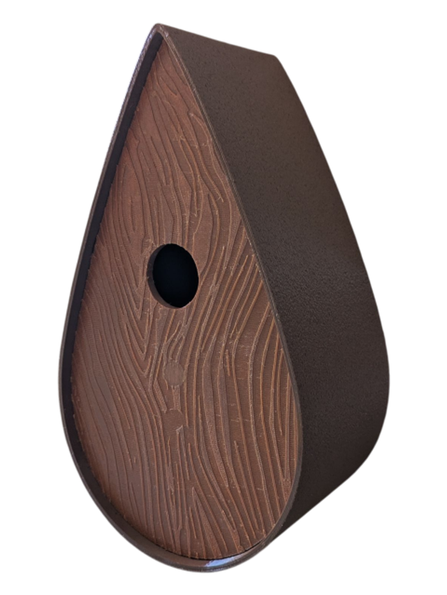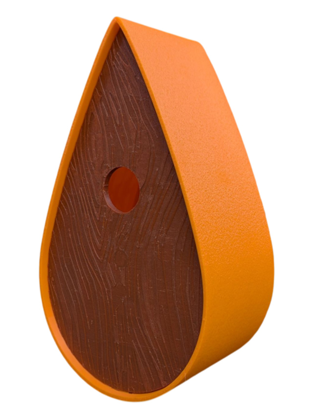 Nichoir à oiseaux de la nature original de style organique en forme de goutte d'eau effet strié soyeux, rugueux et face avant effet bois naturel. Décoration de jardin, décoration d'extérieur. L'idéal pour aider les oiseaux de la nature à procréer et préserver la biodiversité.