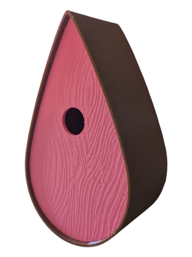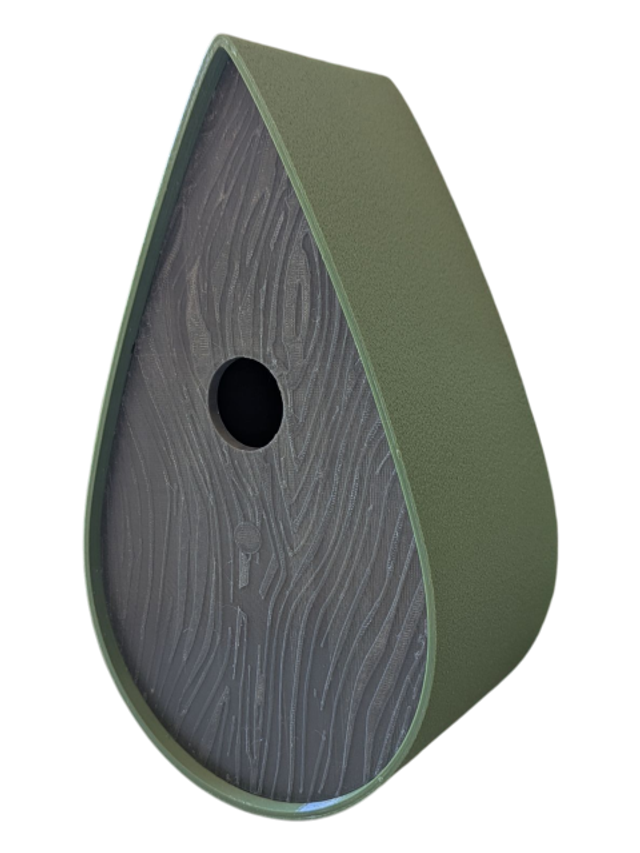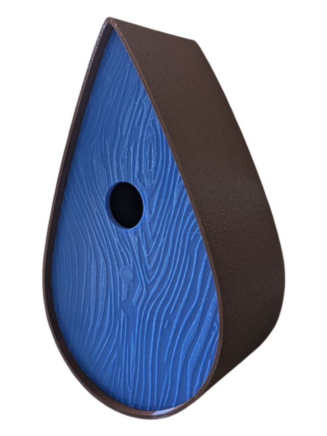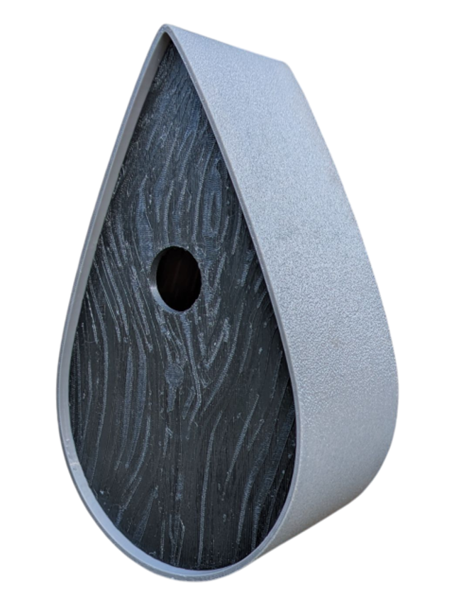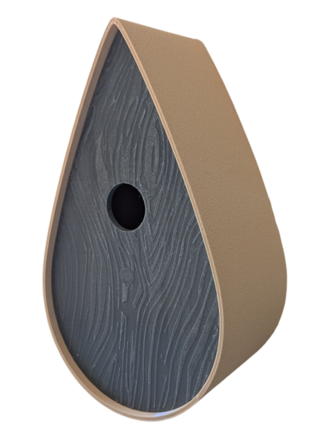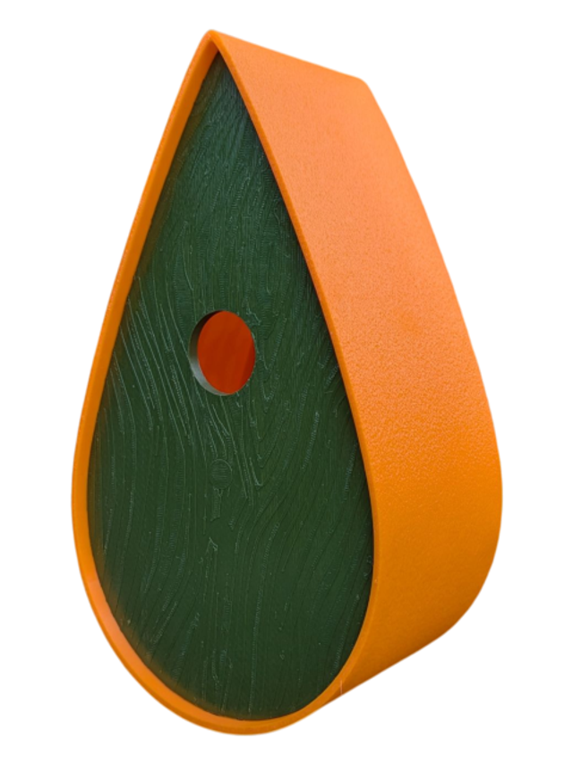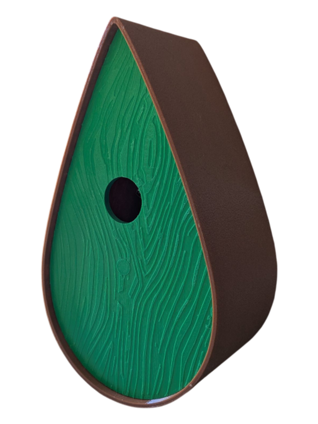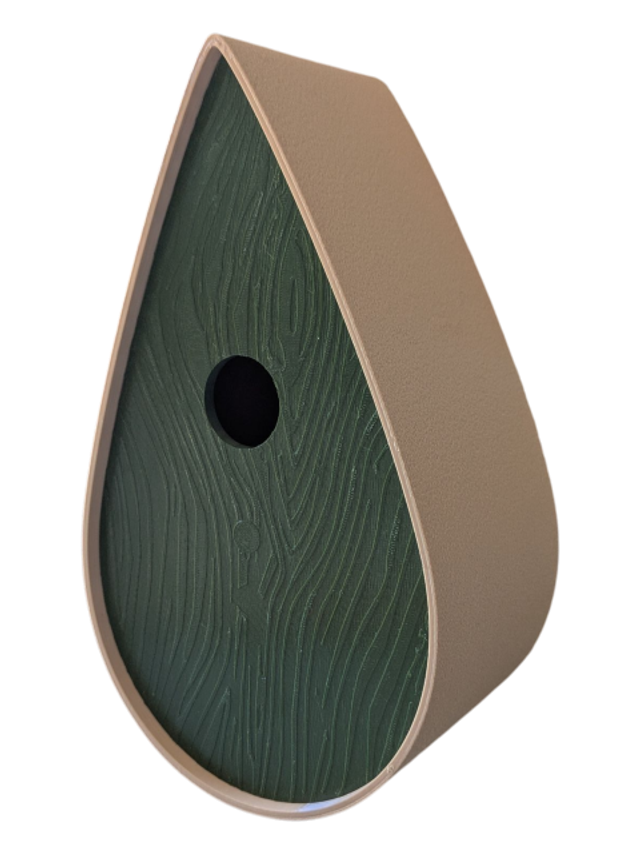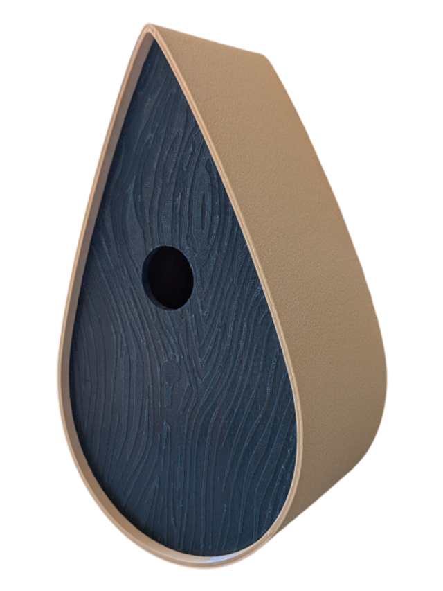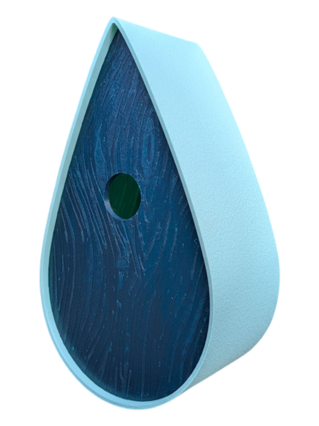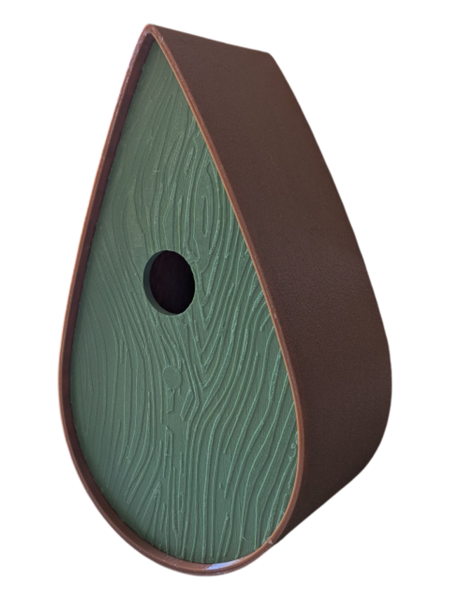 Nichoir à oiseaux de la nature original de style organique en forme de goutte d'eau effet strié soyeux, rugueux et face avant effet bois naturel. Décoration de jardin, décoration d'extérieur. L'idéal pour aider les oiseaux de la nature à procréer et préserver la biodiversité.
