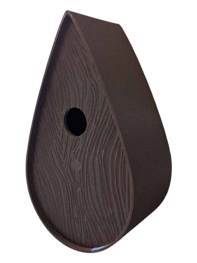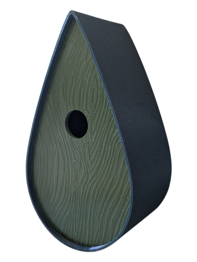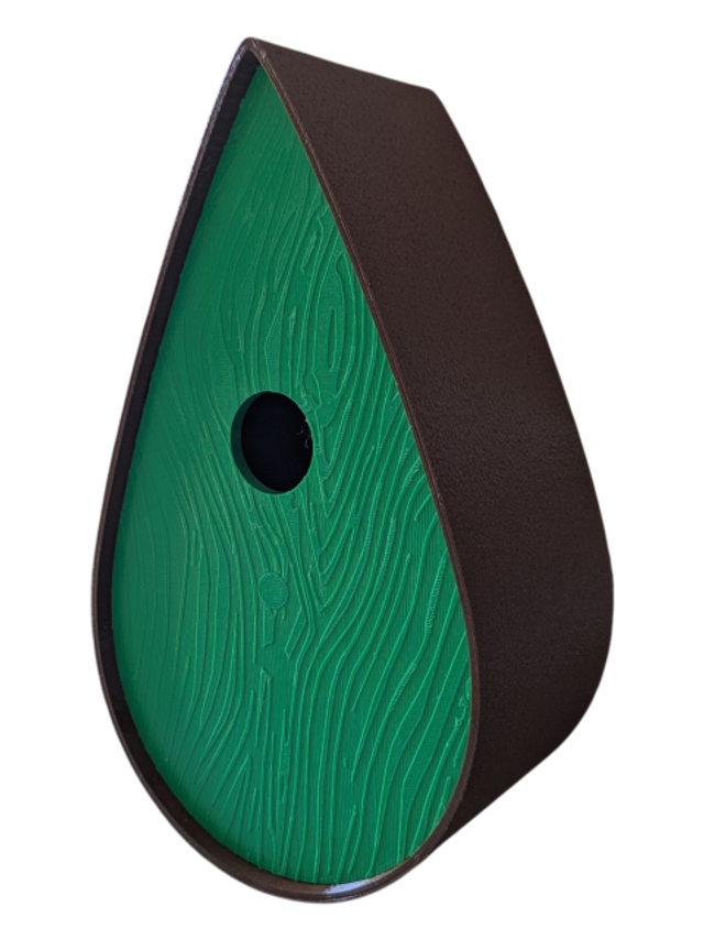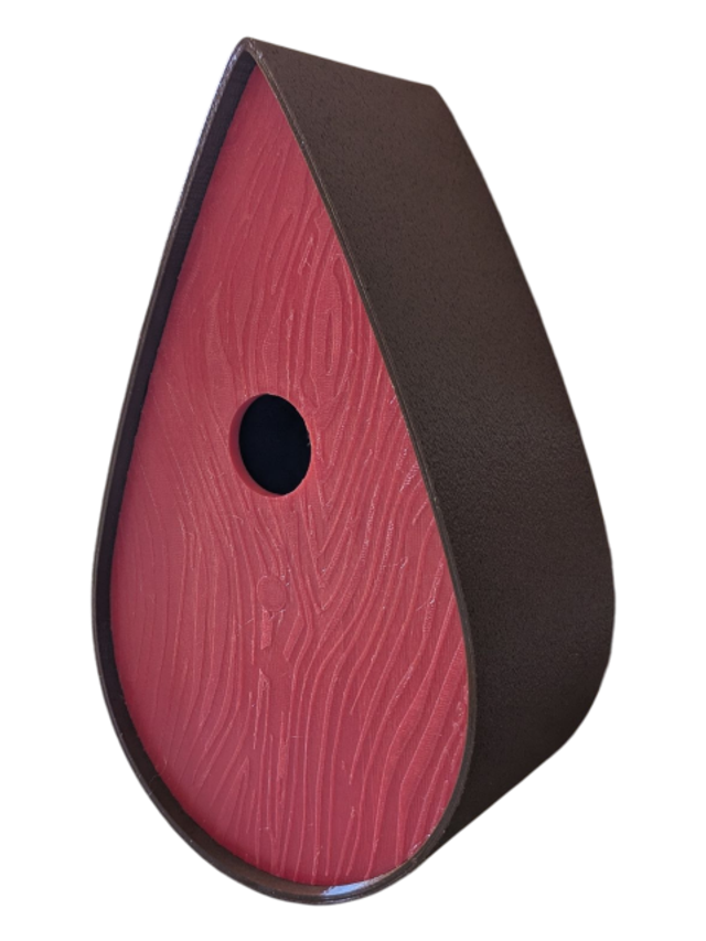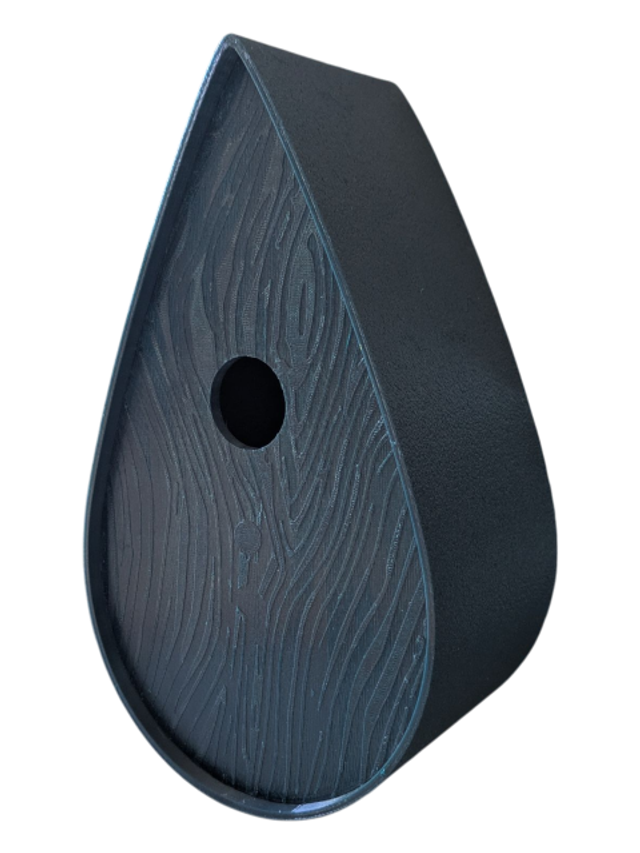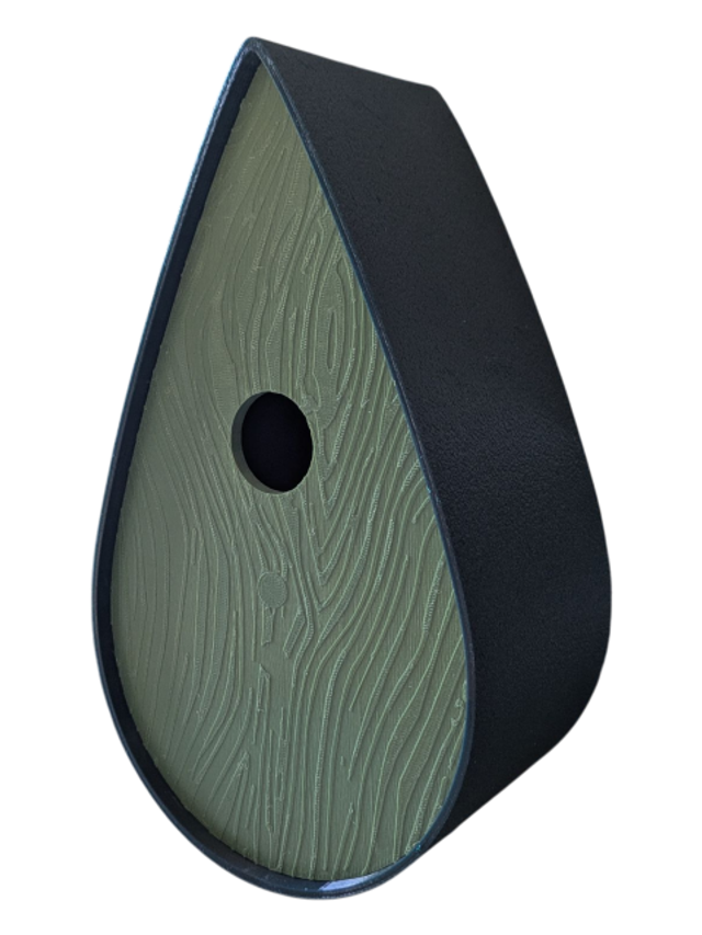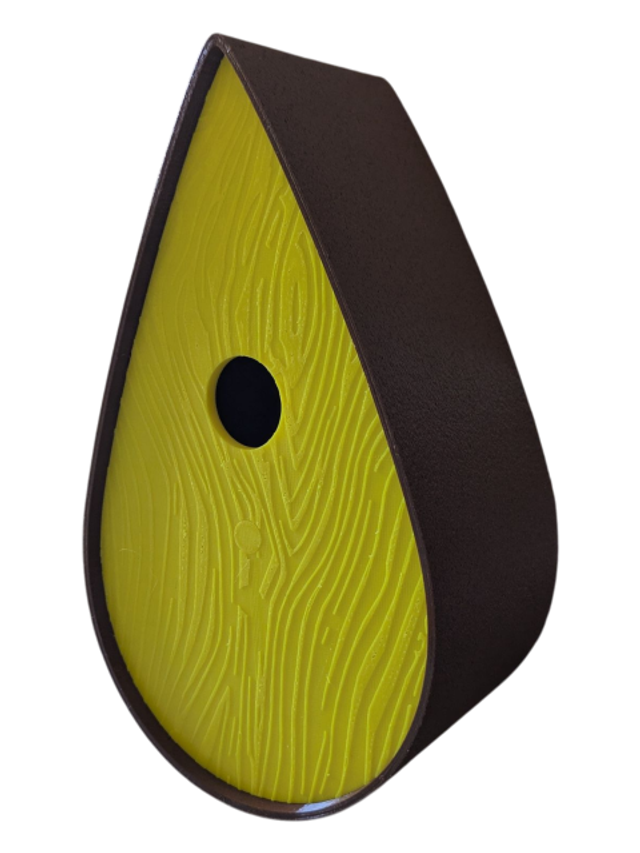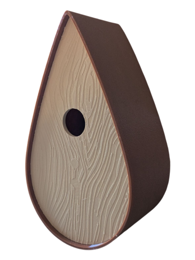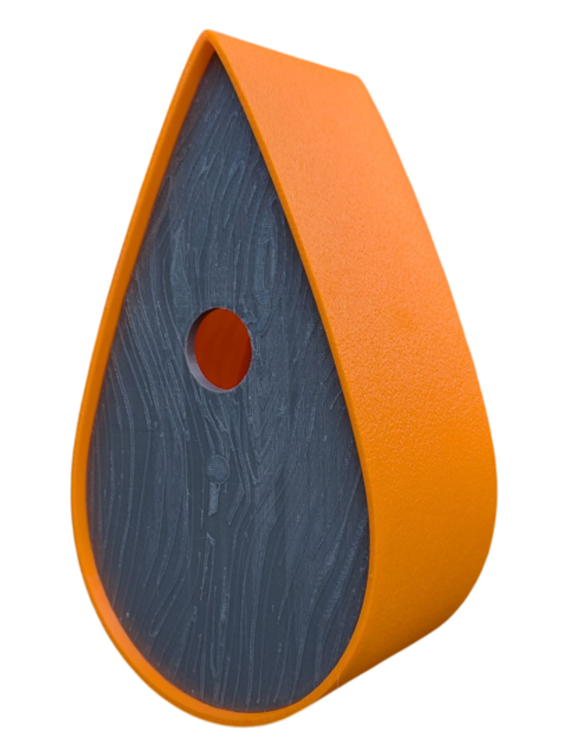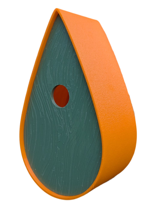 Nichoir à oiseaux de la nature original de style organique en forme de goutte d'eau effet strié soyeux, rugueux et face avant effet bois naturel. Décoration de jardin, décoration d'extérieur. L'idéal pour aider les oiseaux de la nature à procréer et préserver la biodiversité.